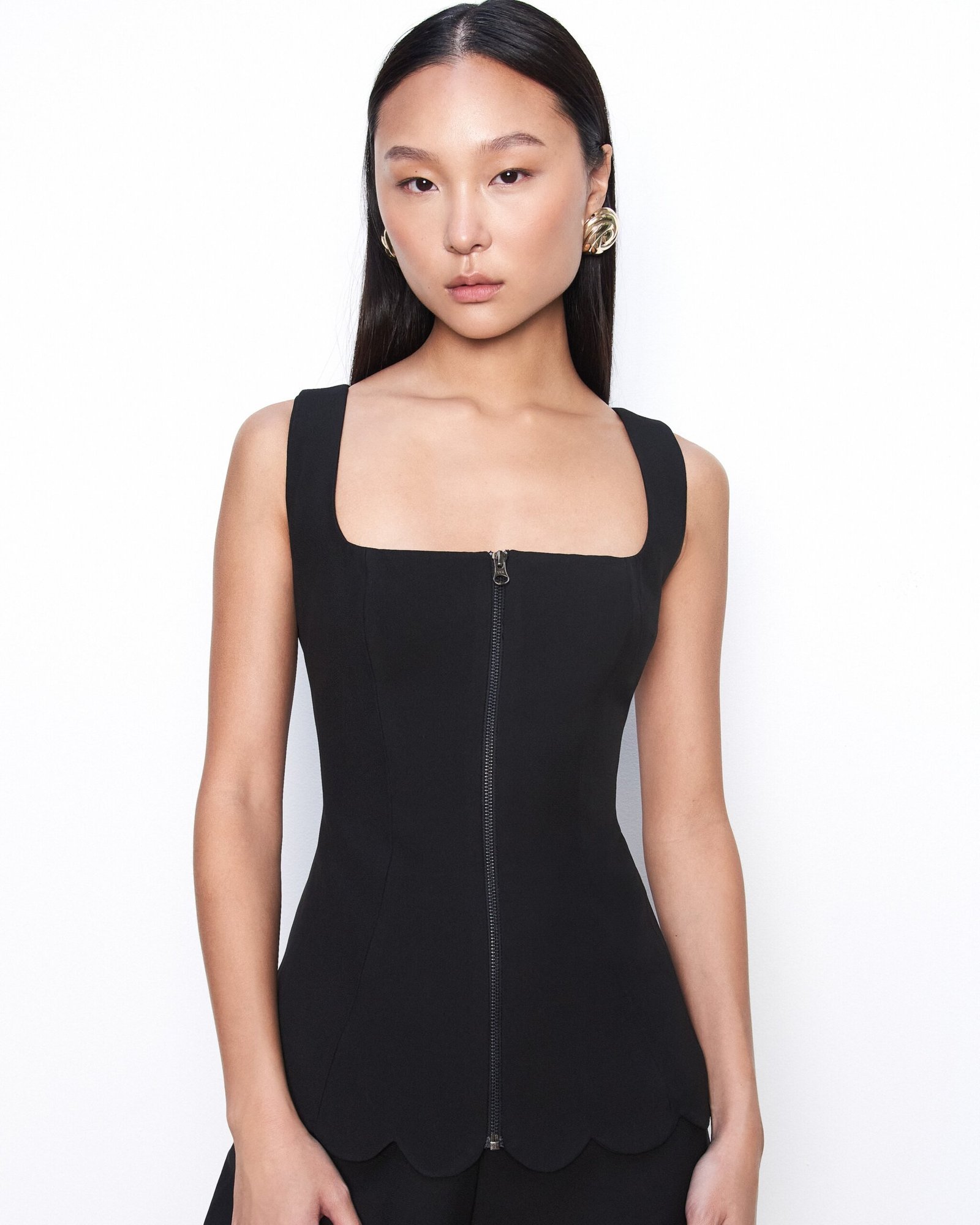 Blusa alfaiataria com recortes peplum, zíper frontal e barra ondas.