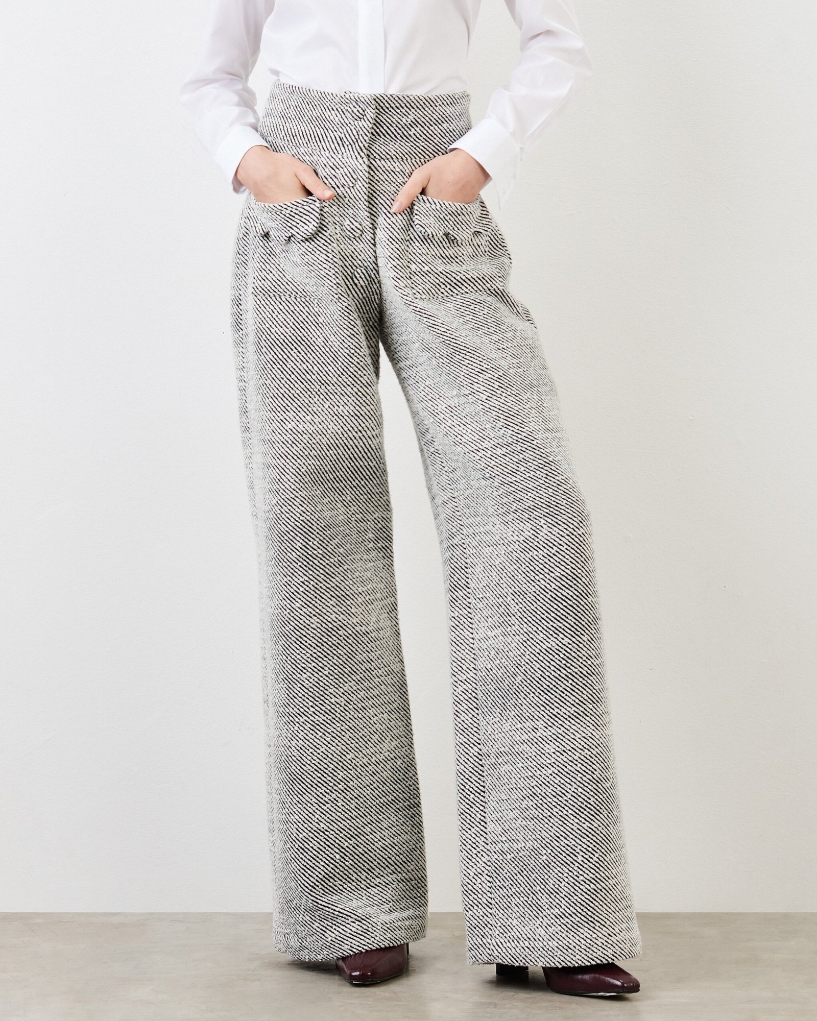 Calça pantalona em chevron com bolsos ondas e botões forrados.