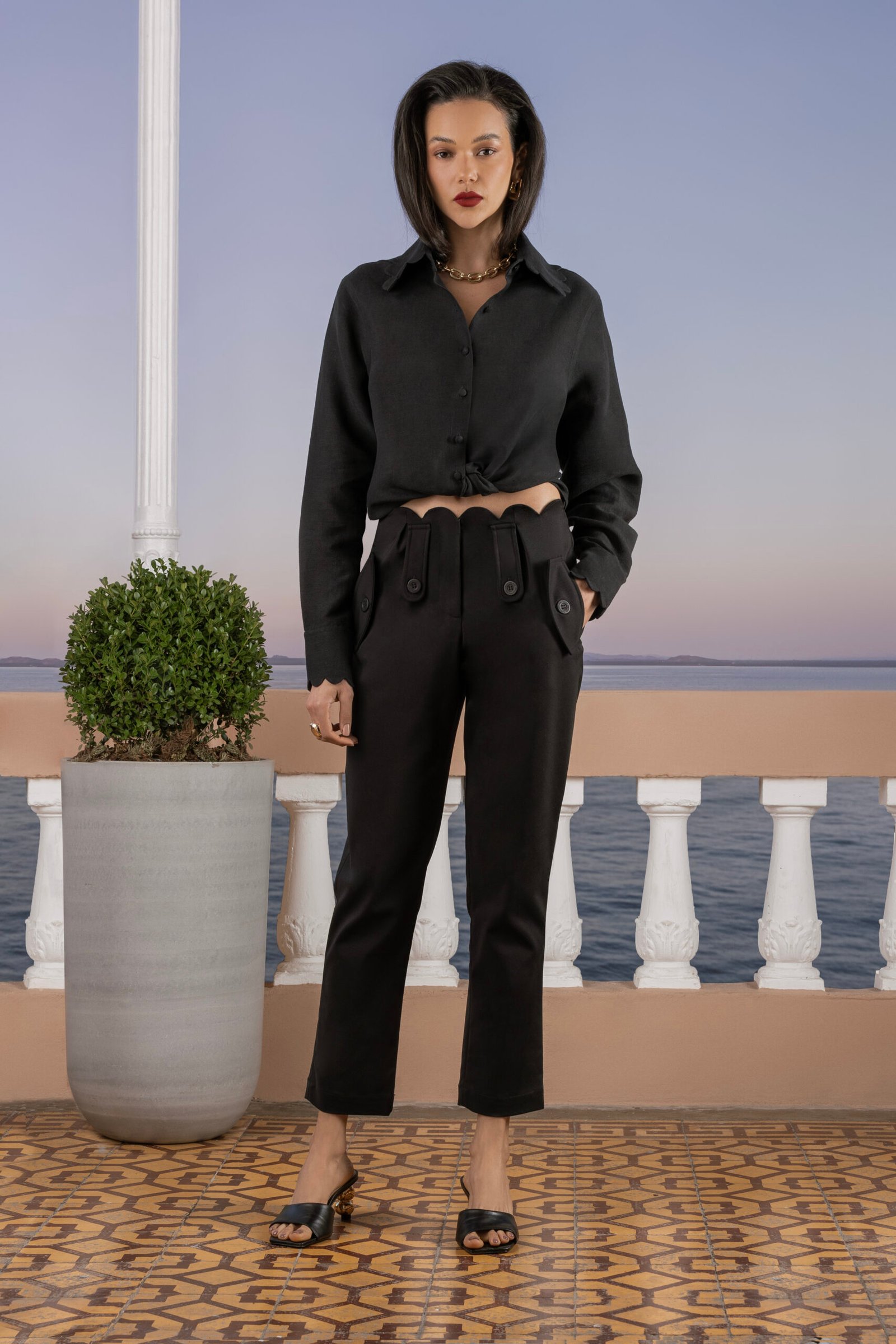 Camisa clássica em linho com gola ondinhas, botões forrados e aplicados manualmente.