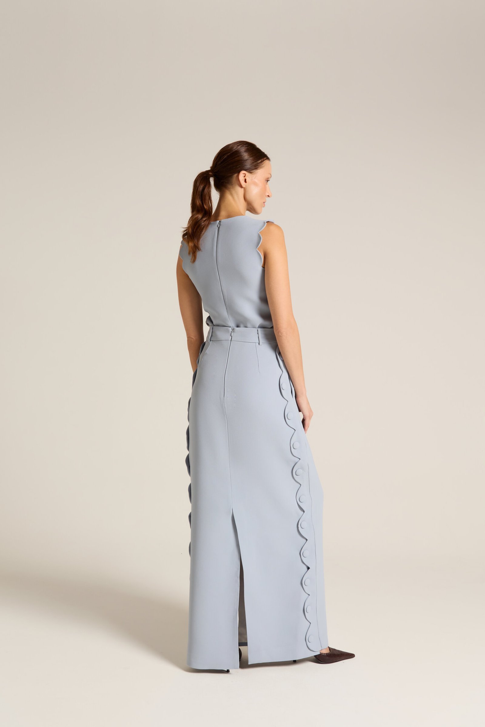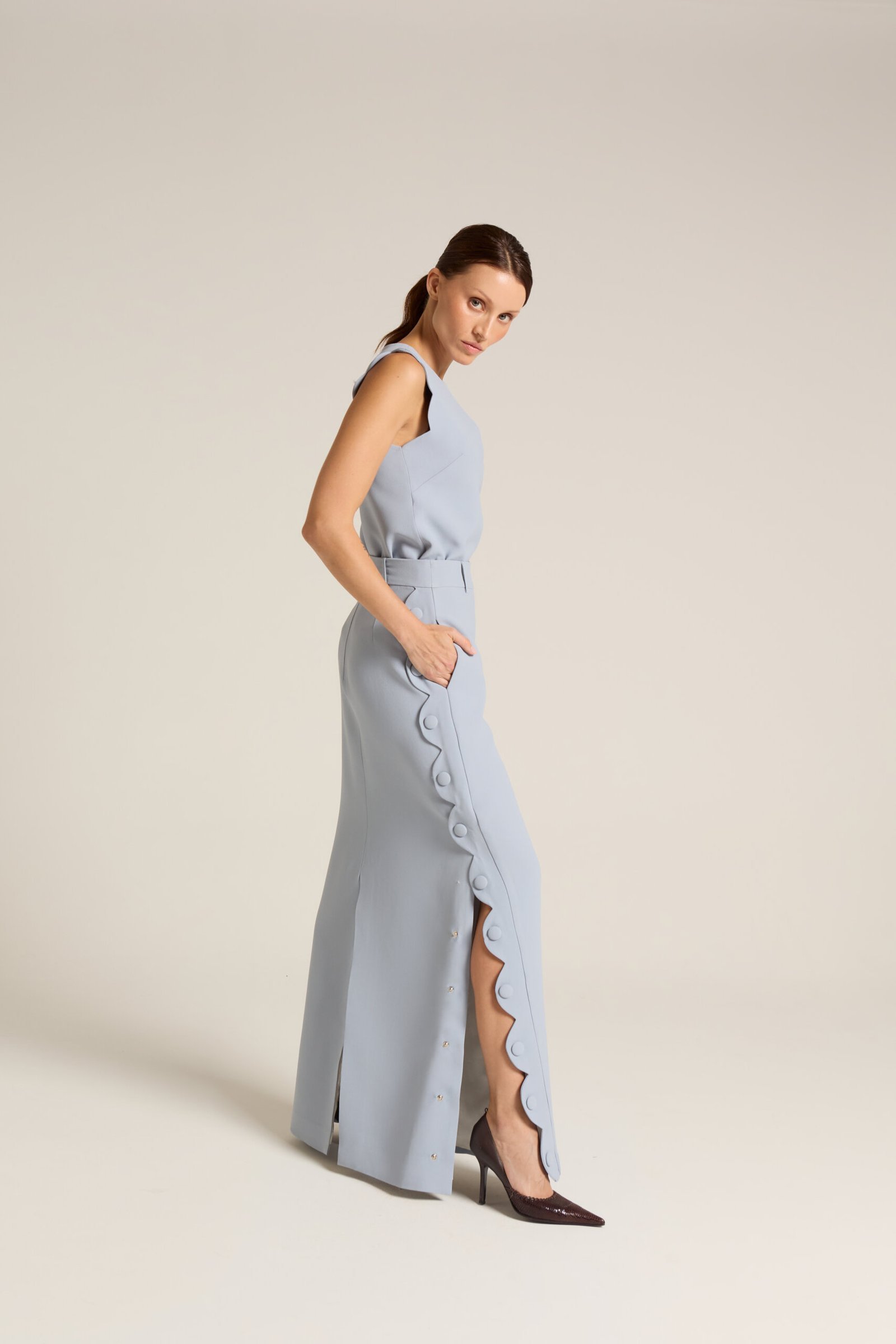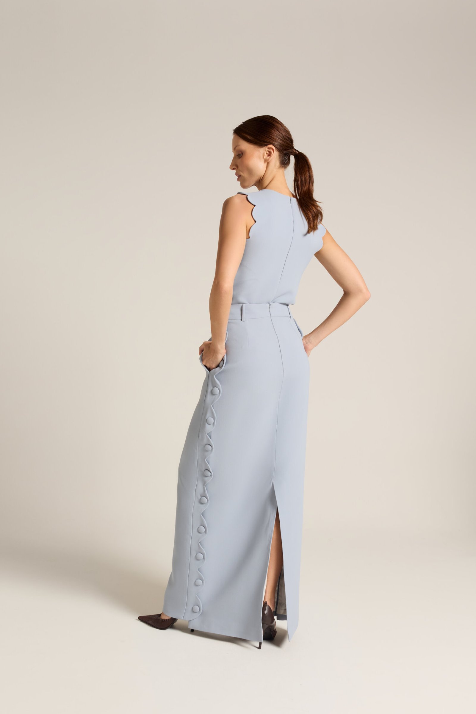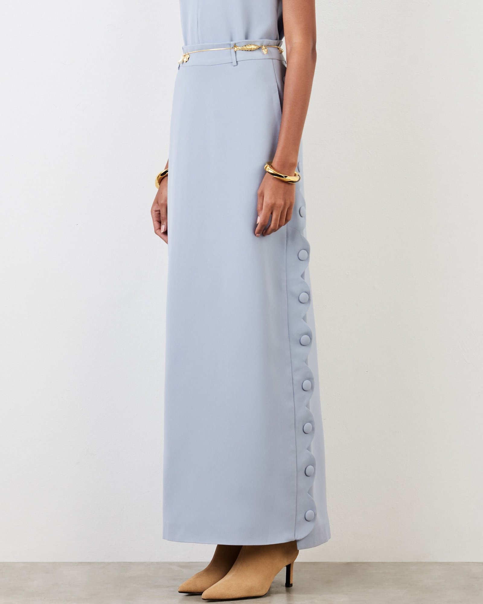 Saia longa alfaiataria com fechamento laterais em botões de pressão aplicados á mão e fenda costas.