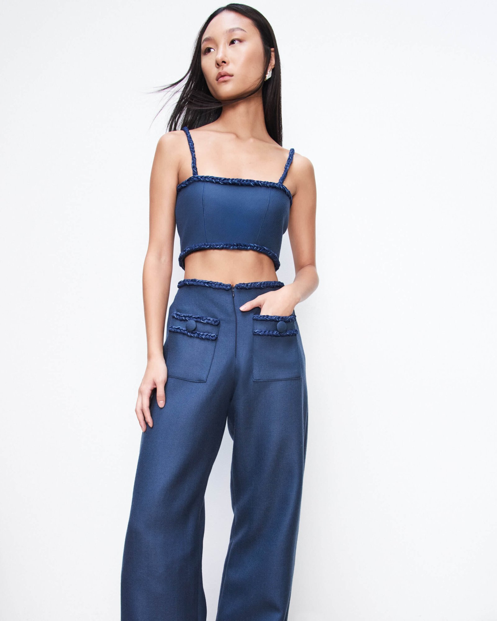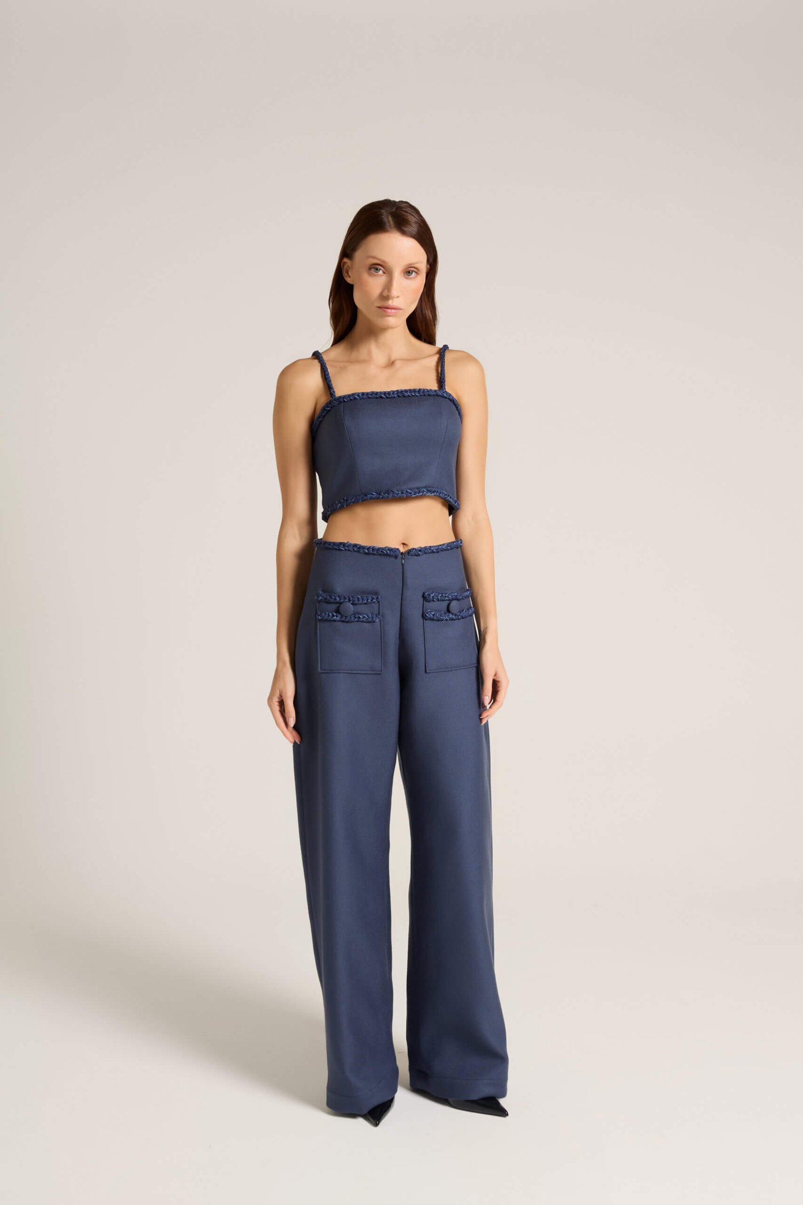 Top 100% lã com alças e decote em tranças feitas à mão e botões forrados.