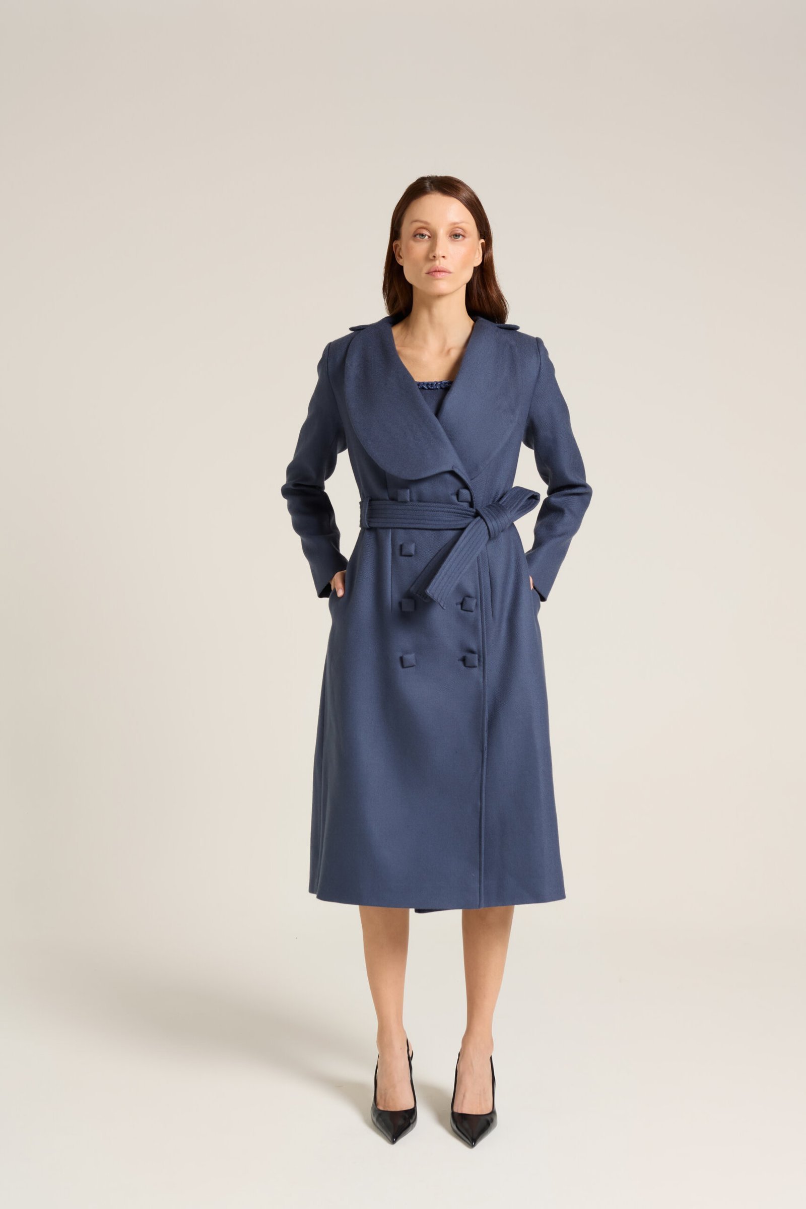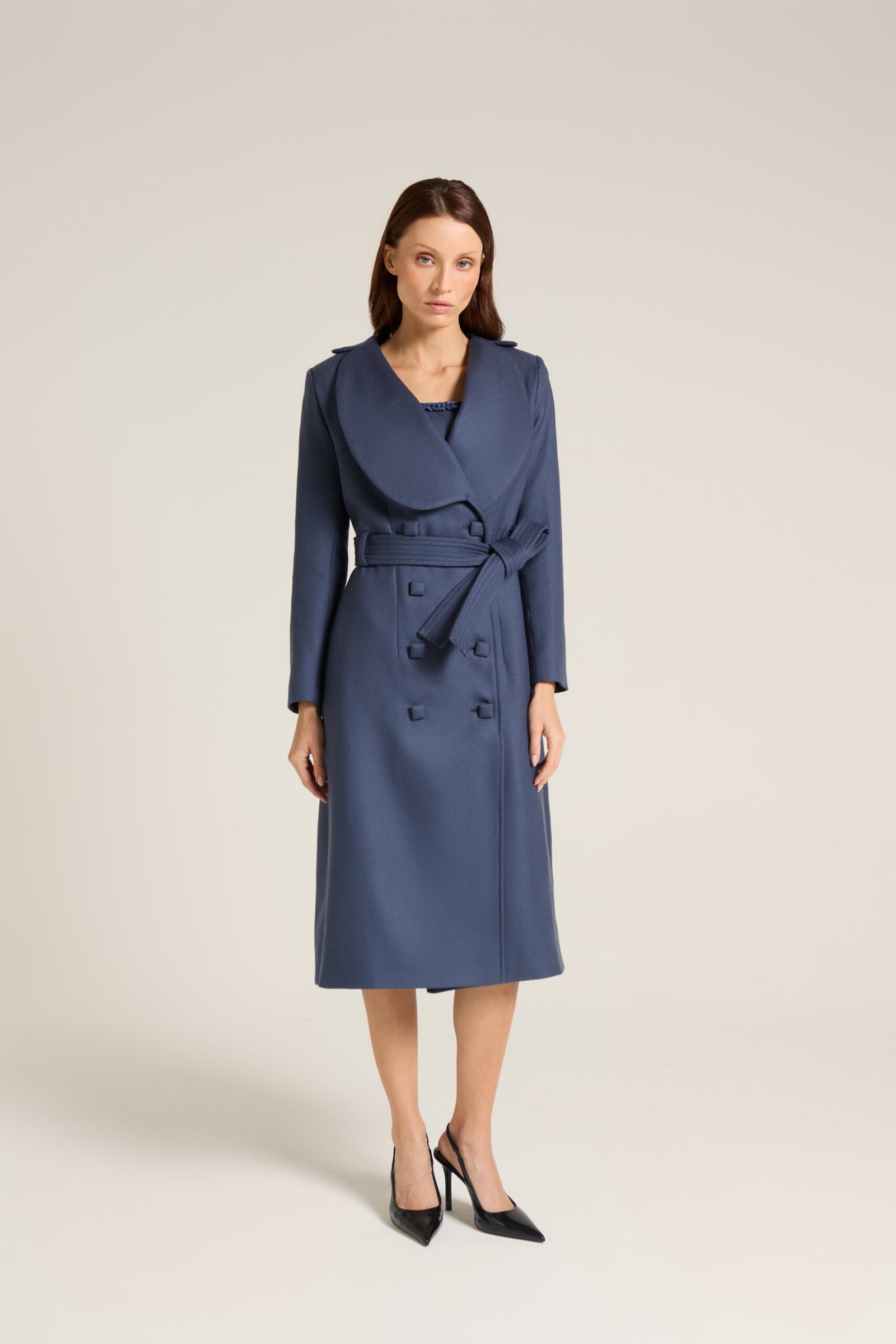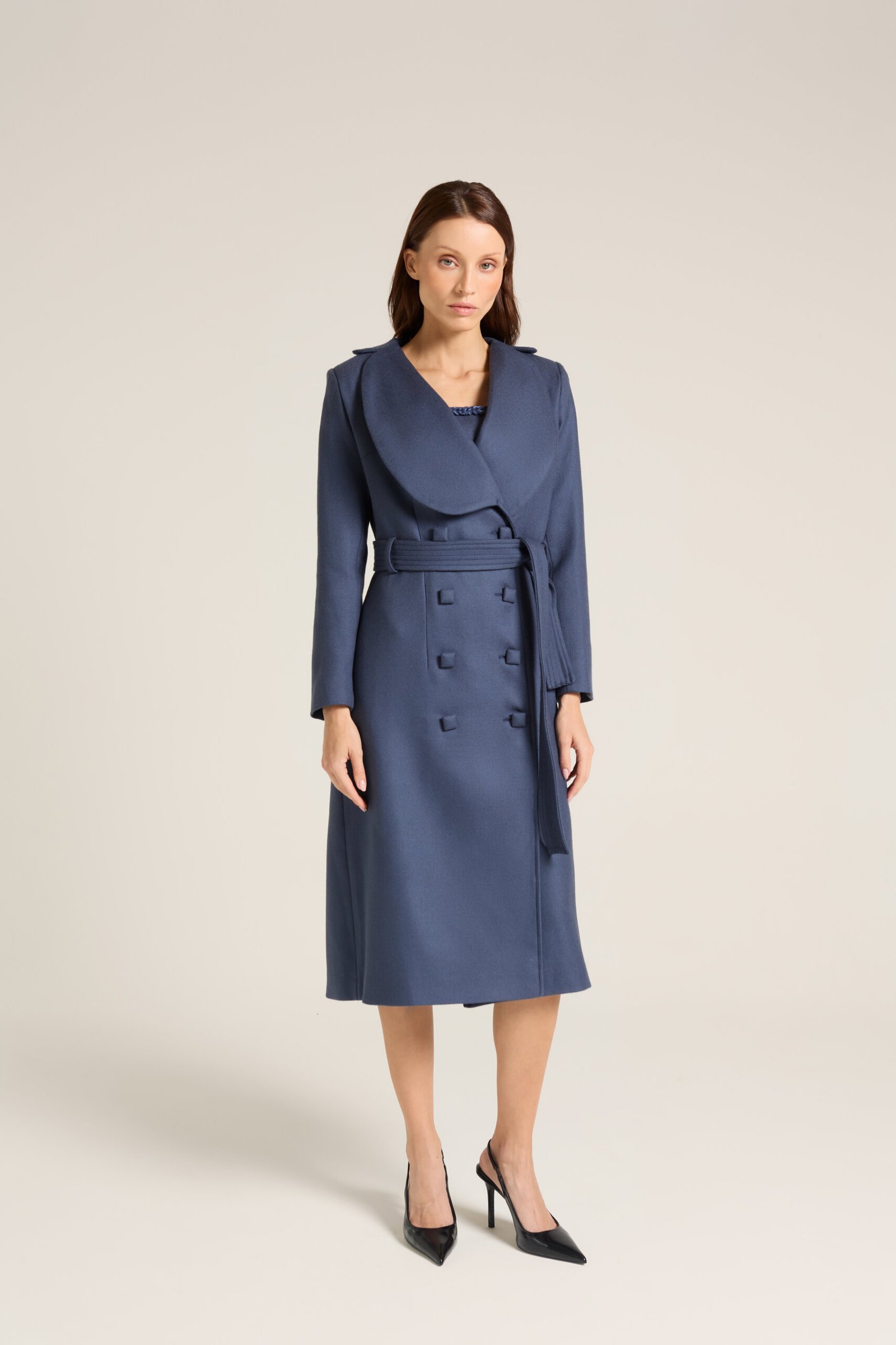 Trent Coat produzido em lã com fivela e botões quadrados forrados.