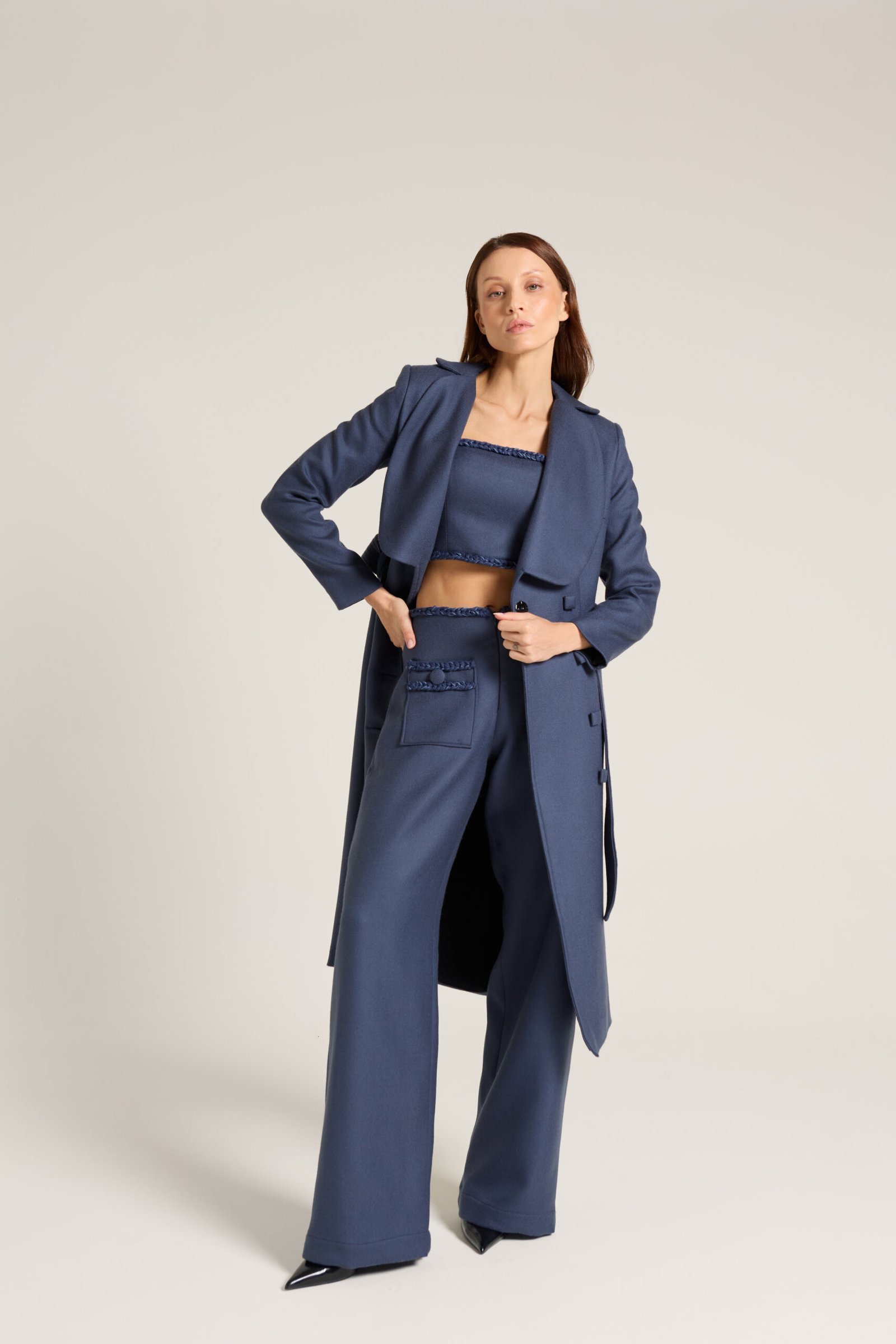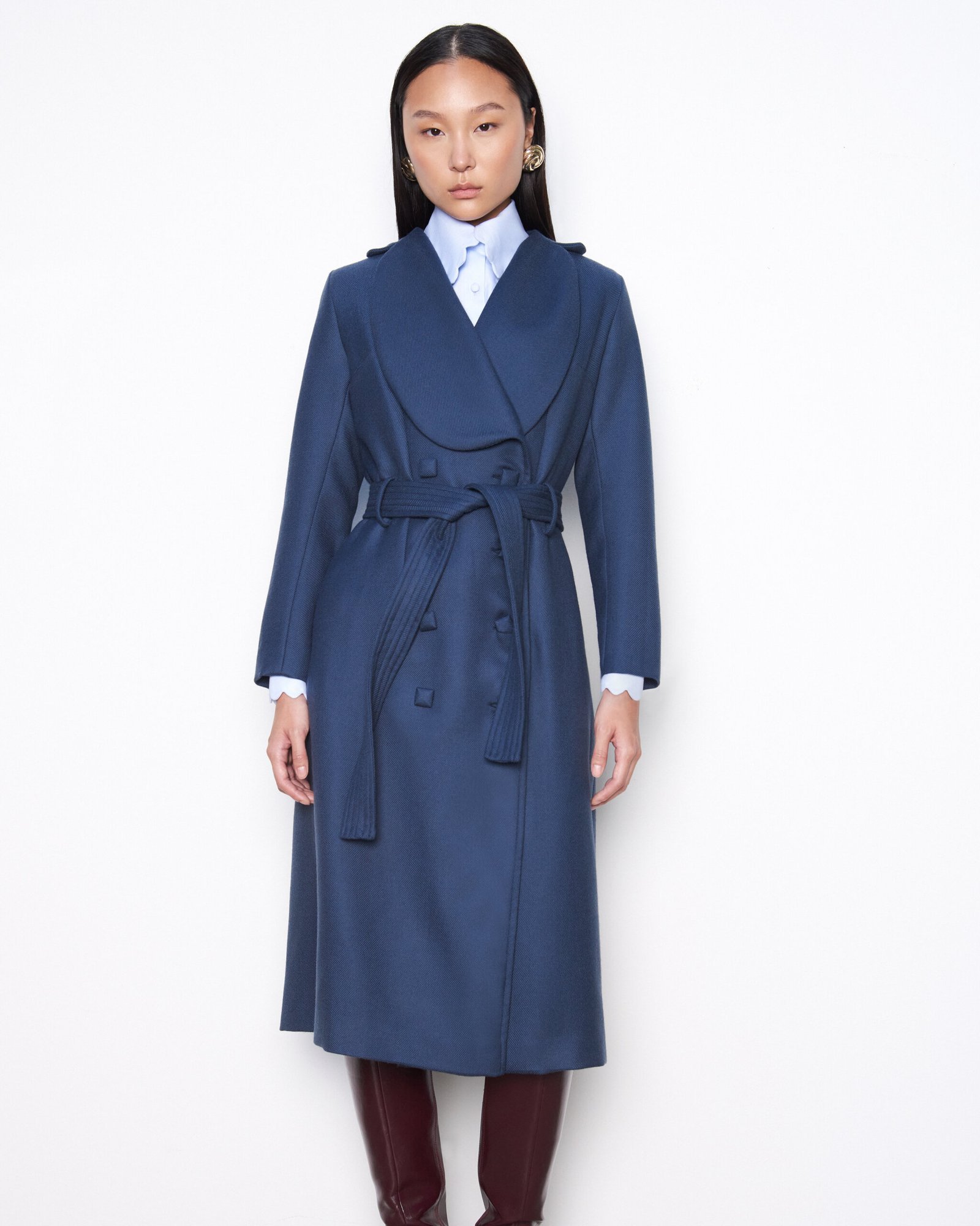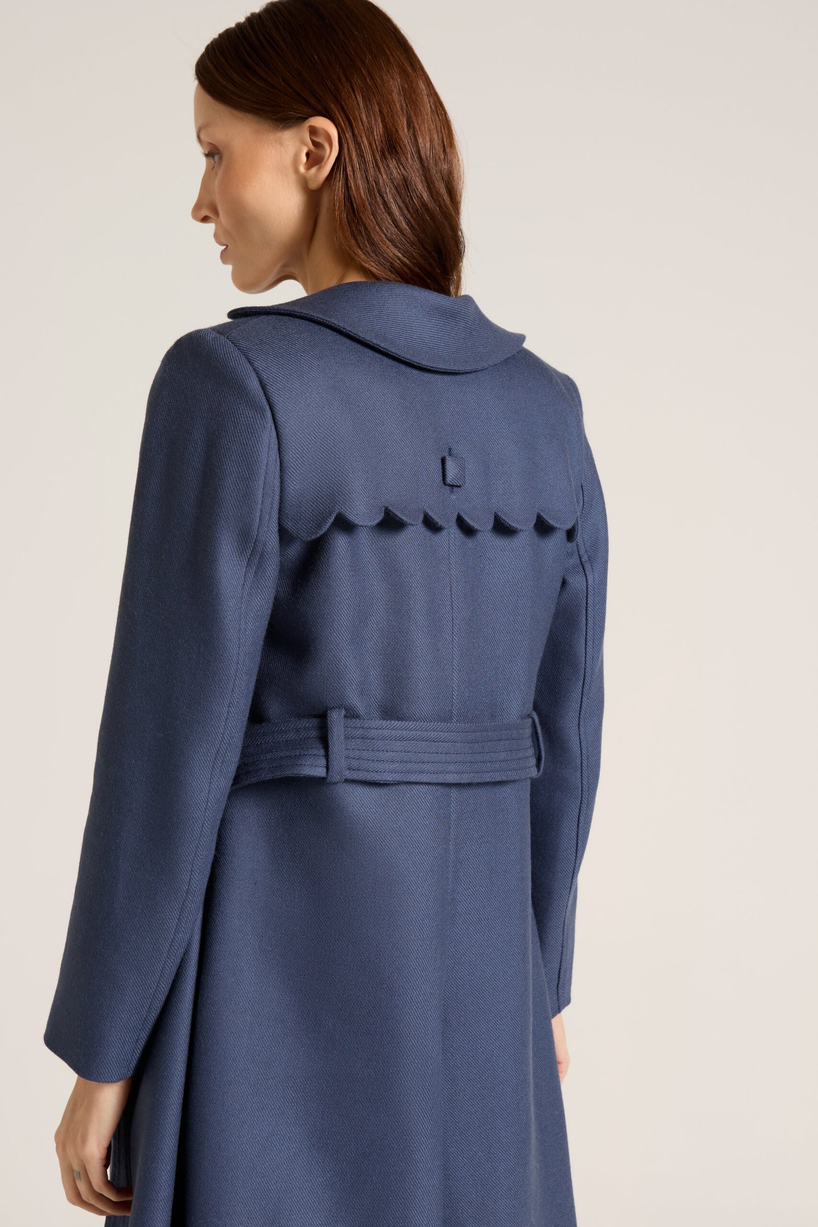 Trent Coat produzido em lã com fivela e botões quadrados forrados.
