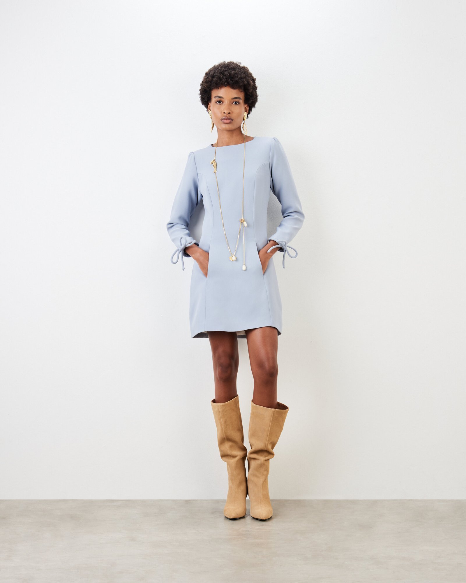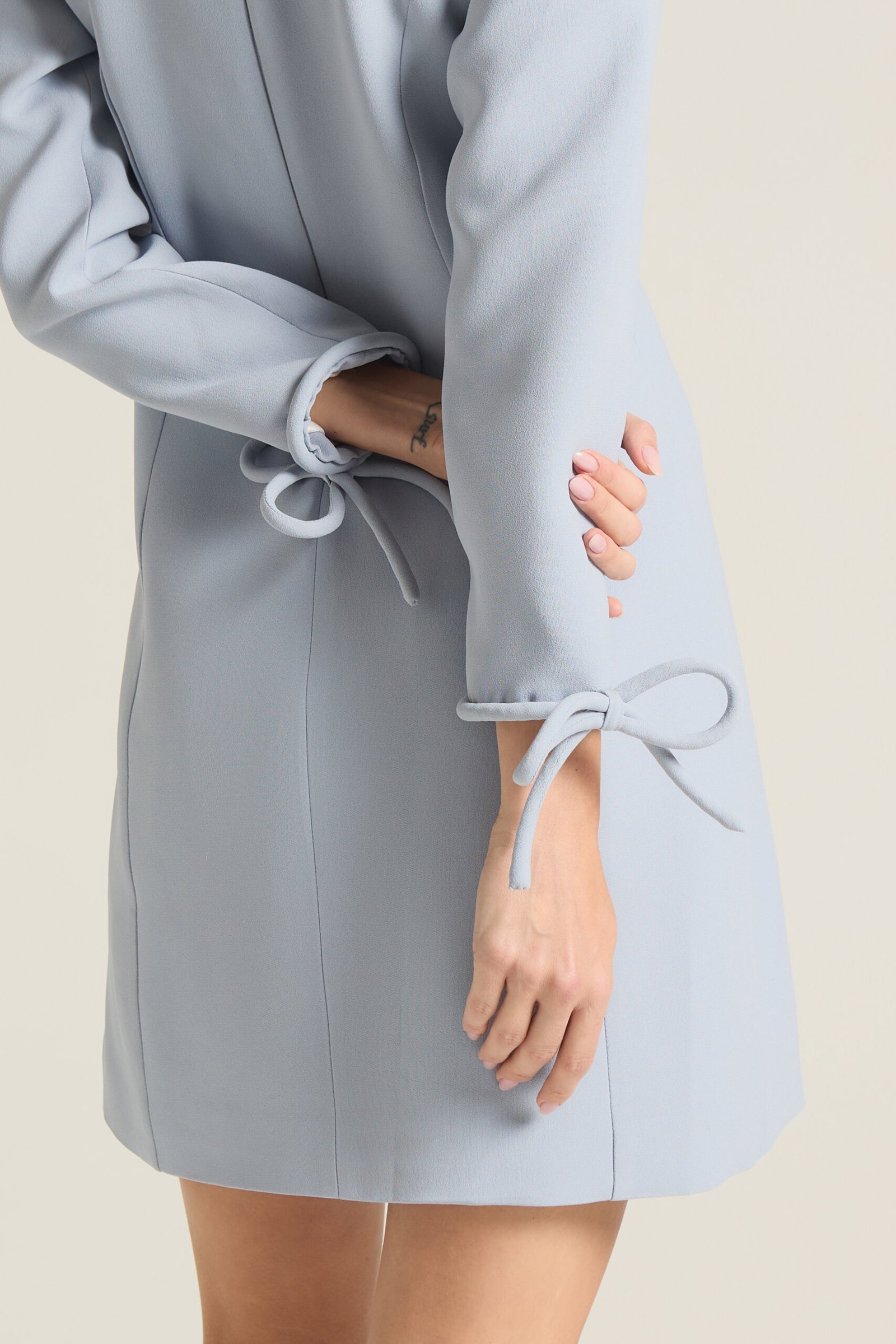 Vestido alfaiataria em crepe patou com bolsos e laço nos punhos produzidos e aplicados à mão.
