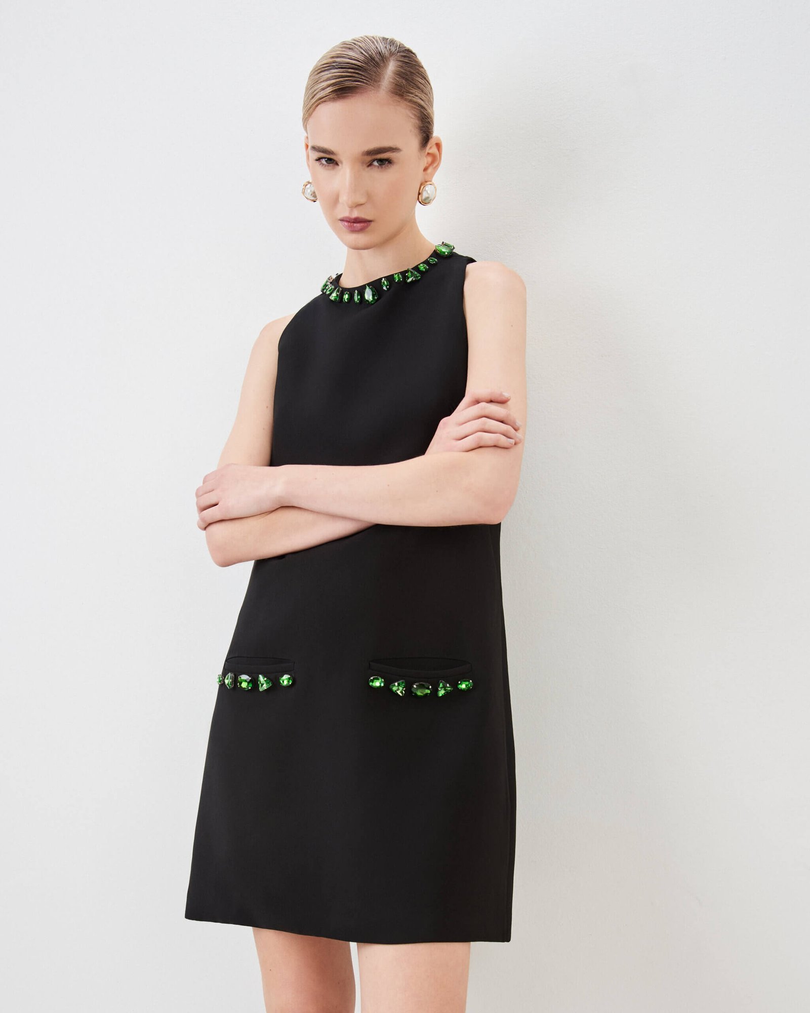Vestido curto alfaiataria com bordado engrampado aplicado à mão.