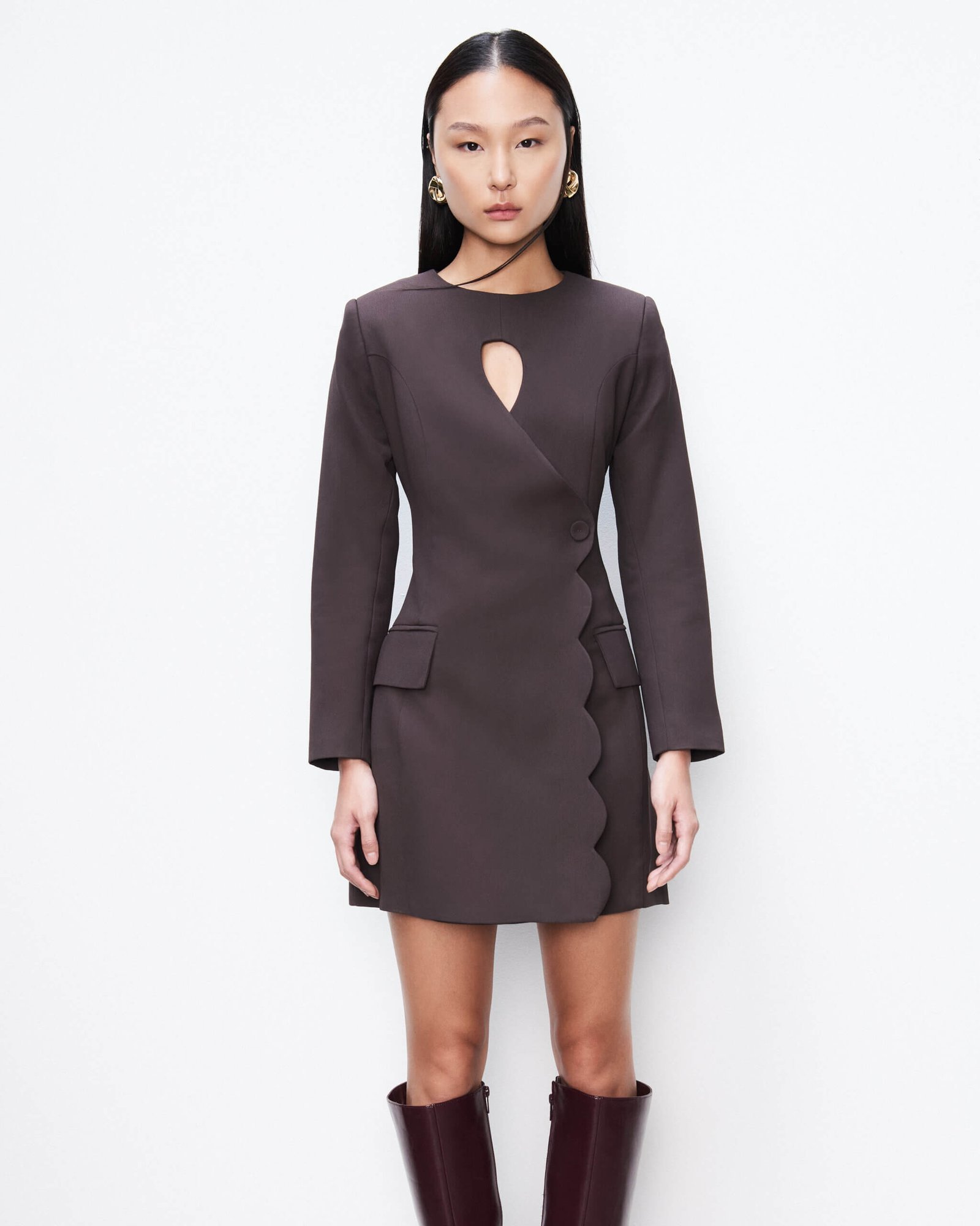 Vestido gota alfaiataria em crepe patou manga longa com bolsos lapelas e detalhe em ondas.