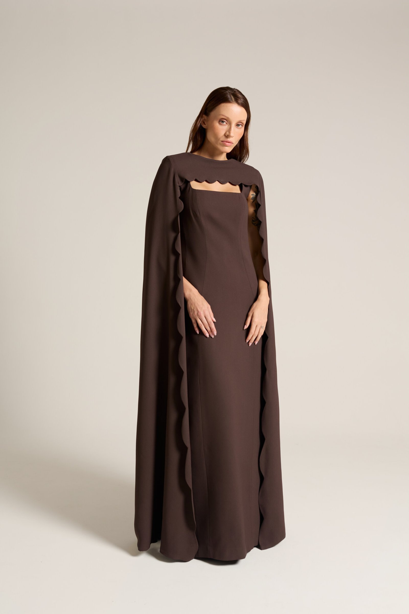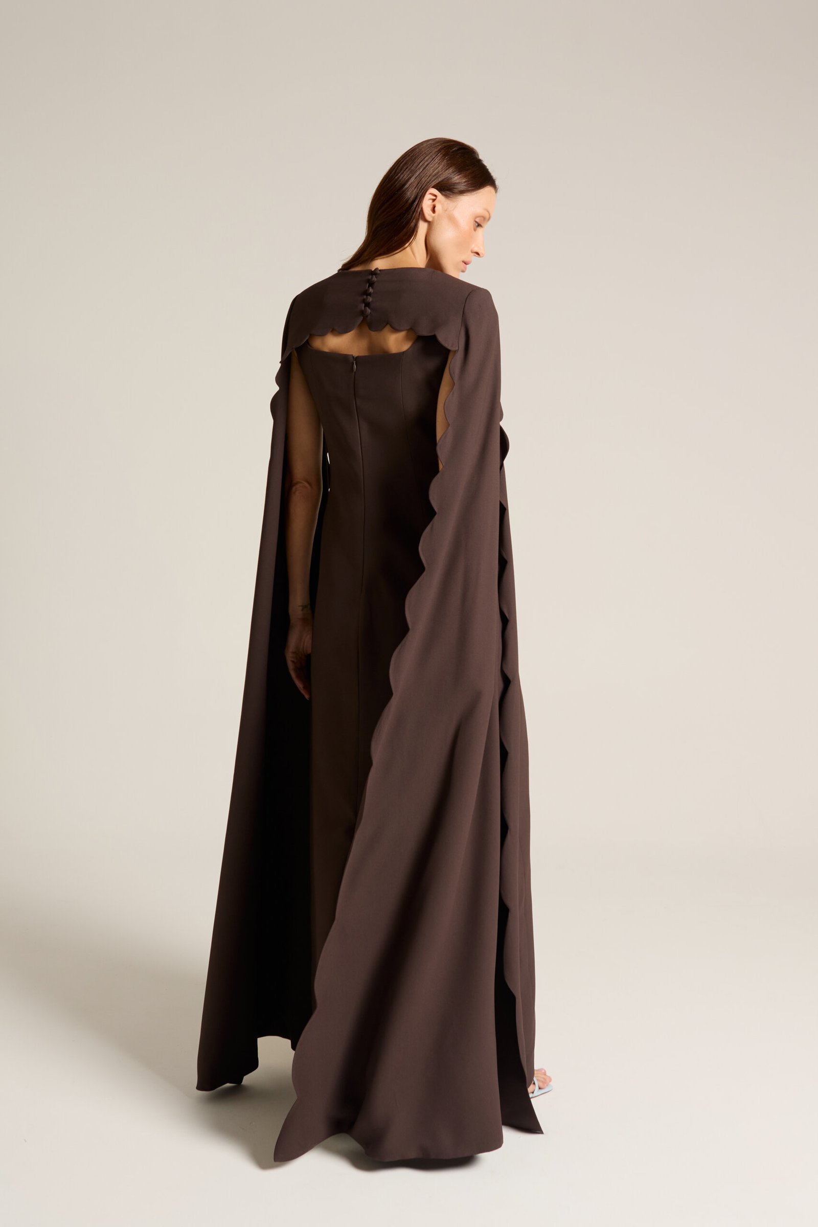 Vestido longo alfaiataria com capa removível em ondas.